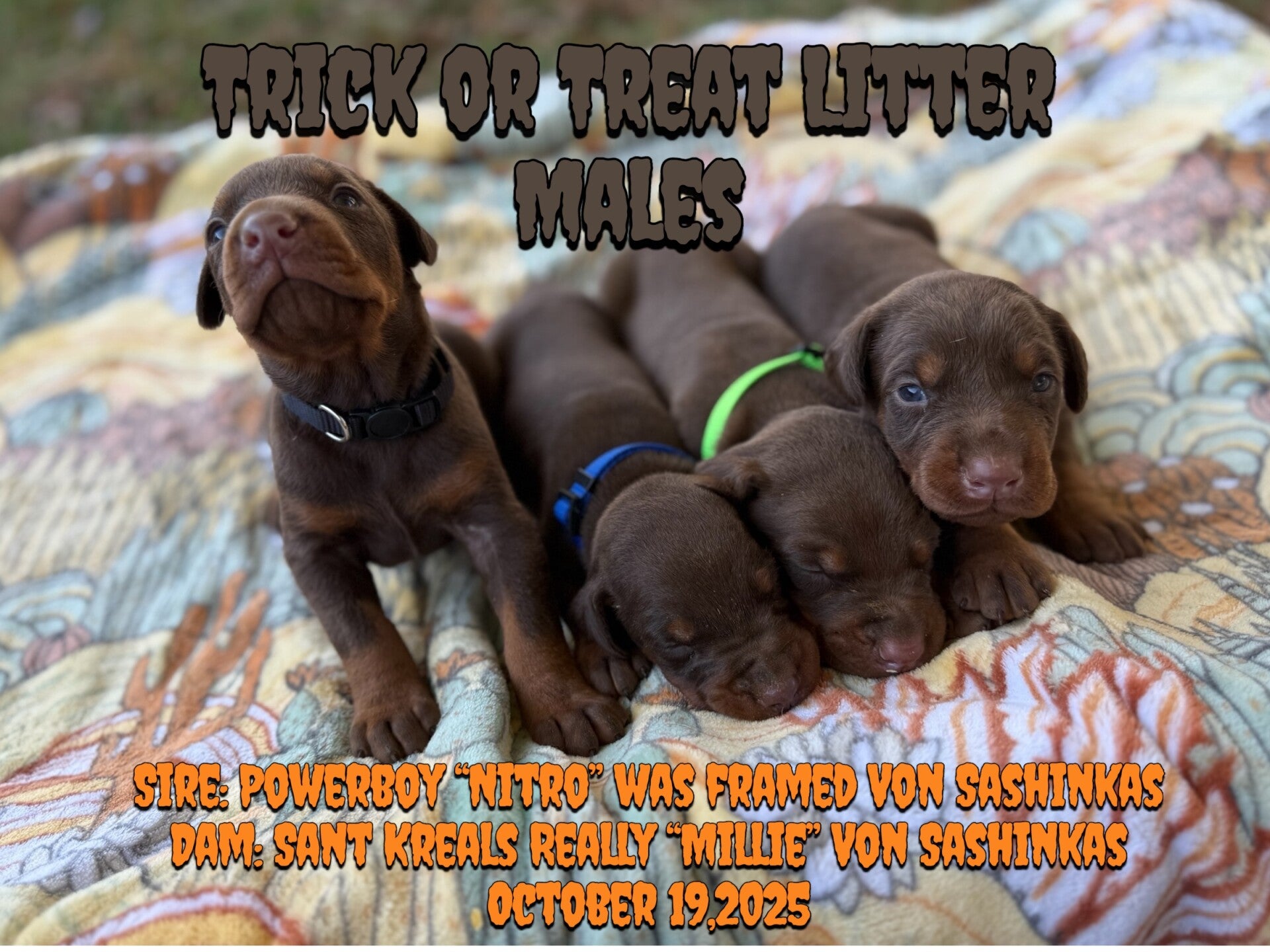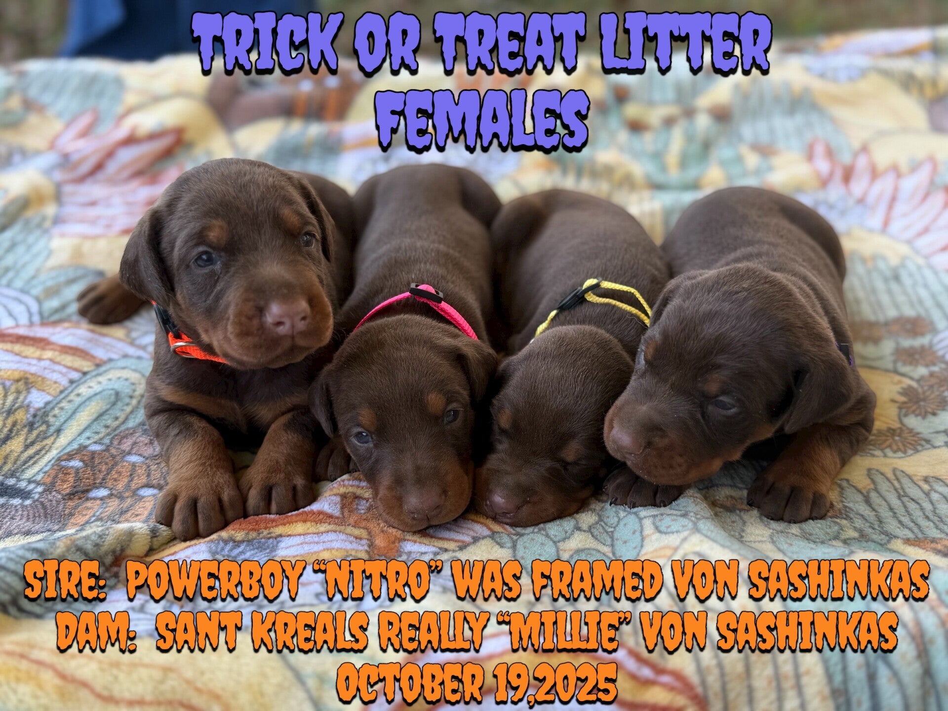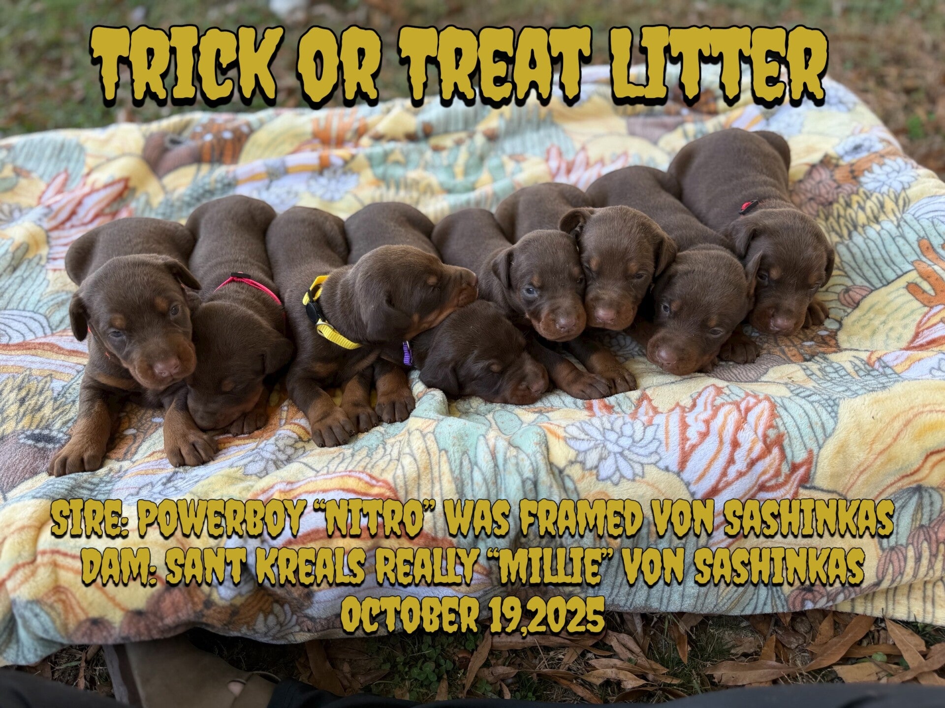 Meet our adorable Halloween-themed litter of 8 red Doberman puppies — 4 handsome boys and 4 beautiful girls.